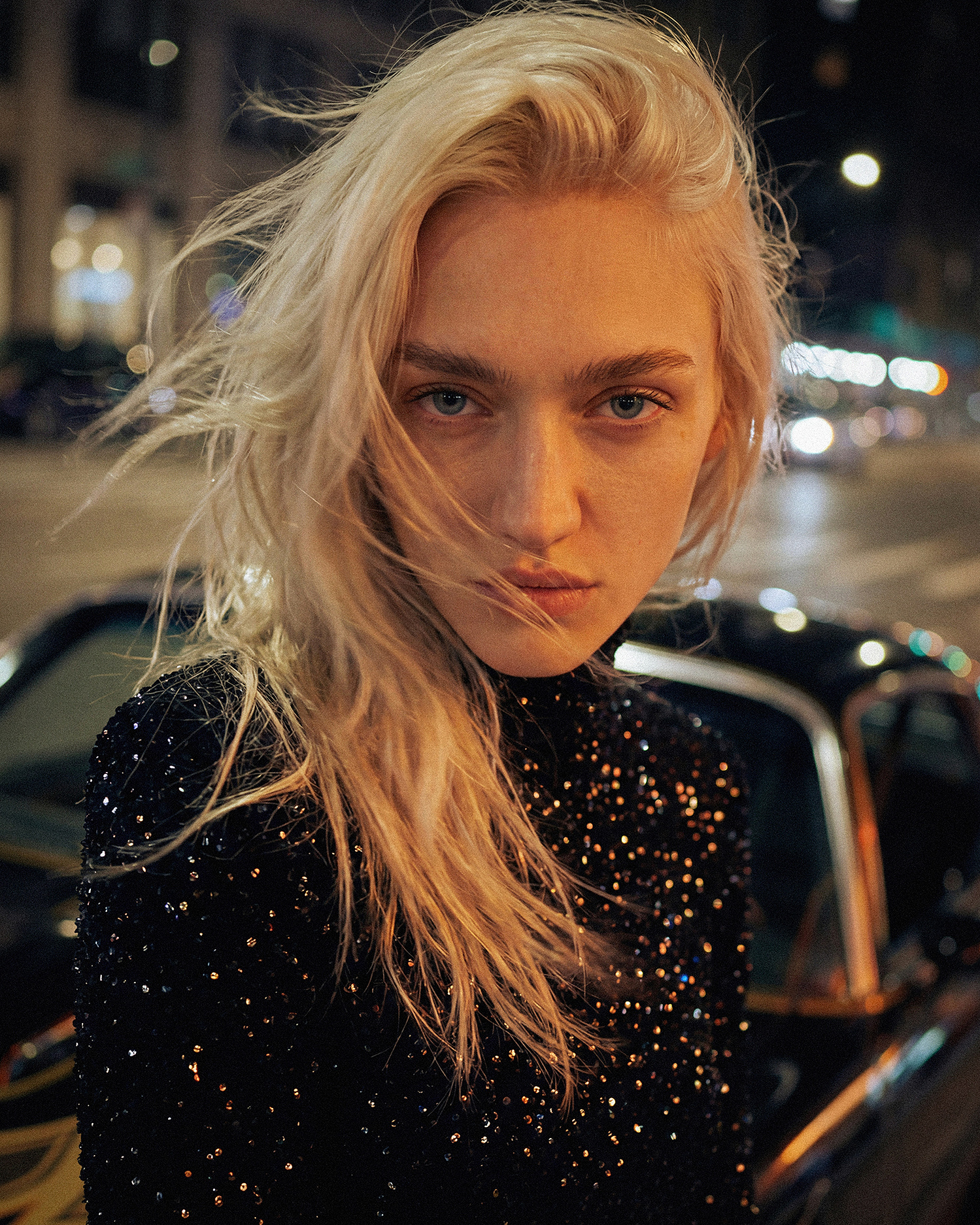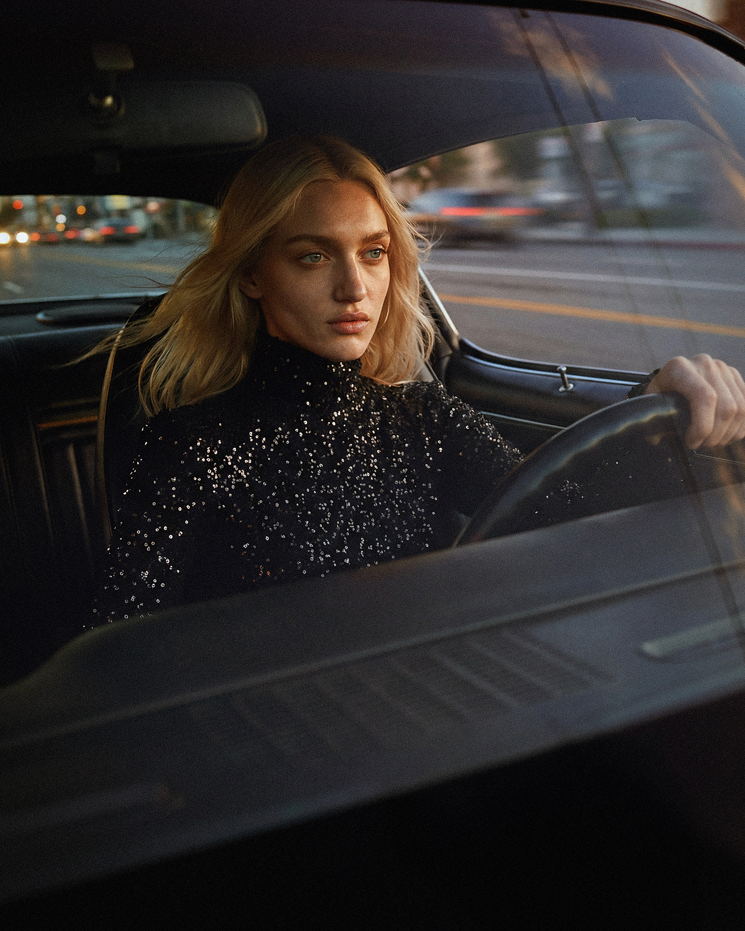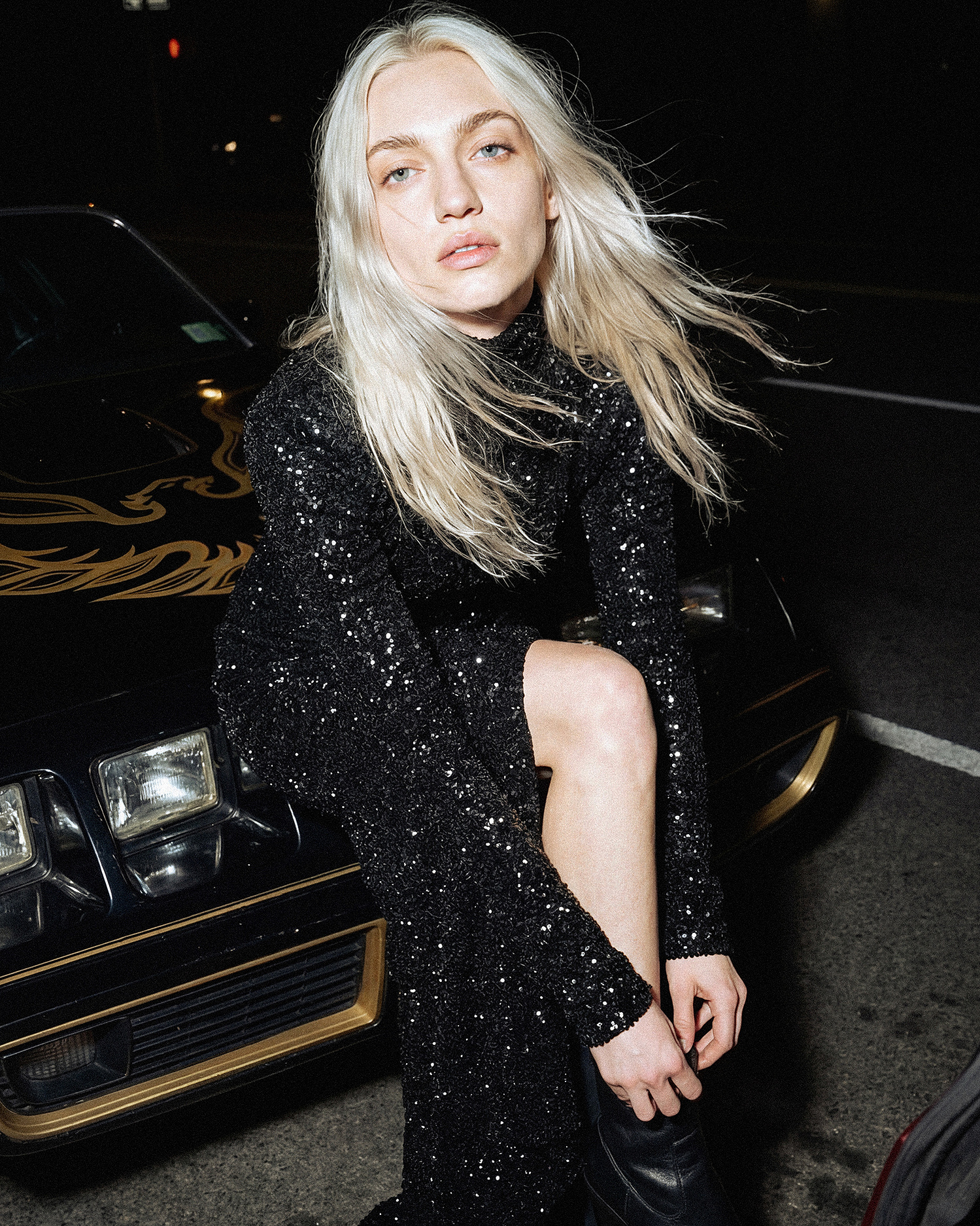 AI-серия. Ночной город, классический мускул-кар и одна героиня — холодная и неуловимая одновременно.