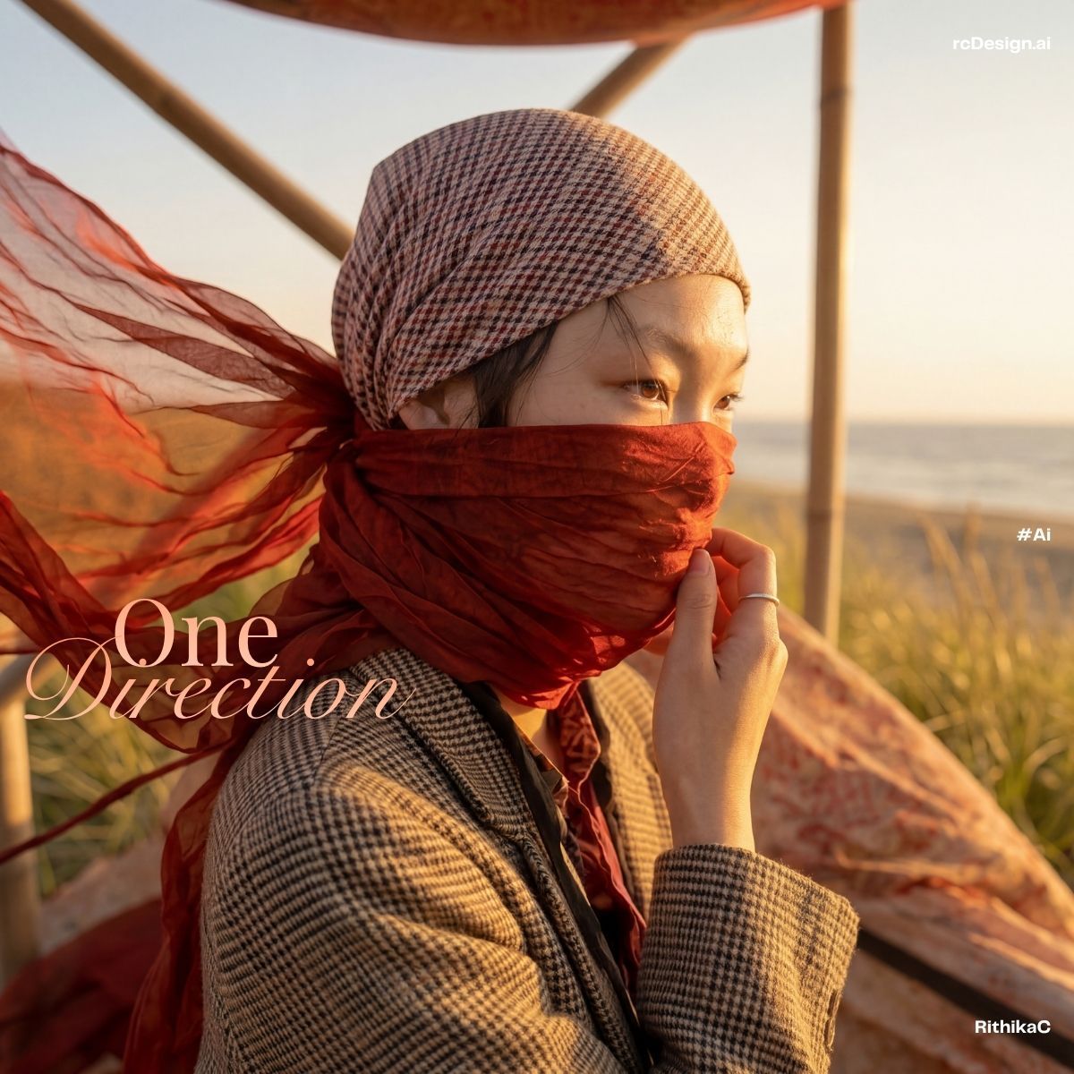 AI фэшн-серия, сгенерированная в сеттинге золотого заката на дюнах у моря.